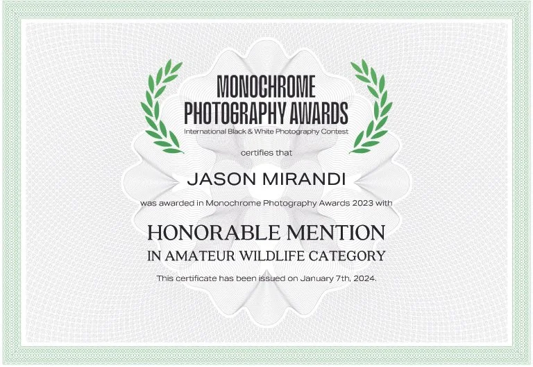 My image of a black vulture, pictured below, which I titled “Guardian of the Dark”, was awarded an honorable mention in the 2023 Monochrome Awards - an international contest recognizing the best in black & white photography. You can find the image in their 2023 wildlife category winner’s gallery and published in their 2023 awards book.